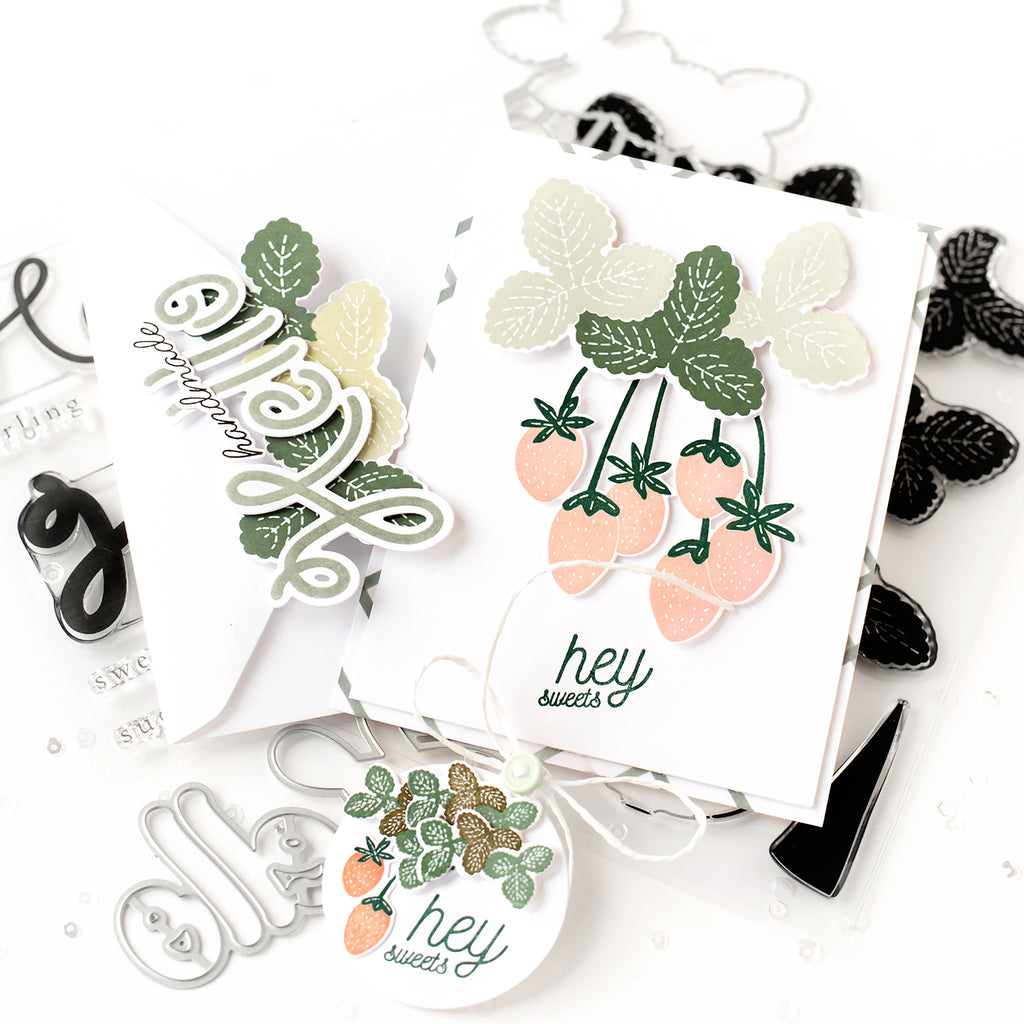 A trendy, hanging strawberry for that perfectly sweet focal point. Plenty of layering stamps as well as a stack of bowls for extra versatility. TIP: cut the berries and tuck them in! This set works beautifully with our Berry Sentiments and Jumbo Berry stamps.