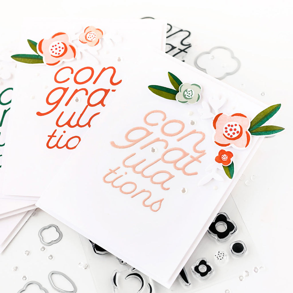 A painterly flower with an artistic flair. Stamp it up, add the ‘maker strokes’ and admire your cutie creation. To stamp the leaves, stamp the left side first, in a lighter hue, and follow up with the right, in a punchy color. These blooms coordinate perfectly with our These Hands: Bake Cakes stamps and dies.