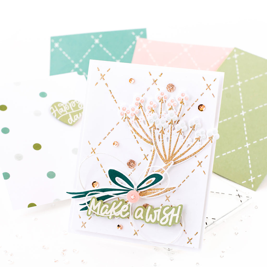 Inspired by our Dashed Diamond cover plates, a new background stamp is in the house! While it does not line up with the cover plate per se, it is another fun way to add a delicate diamond pattern! It looks beautiful embossed in white, on colored stock.