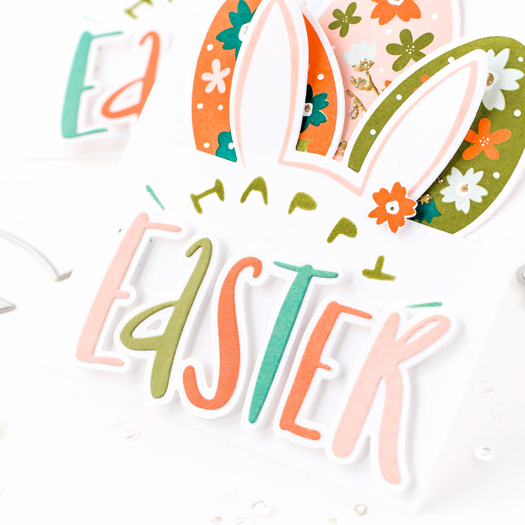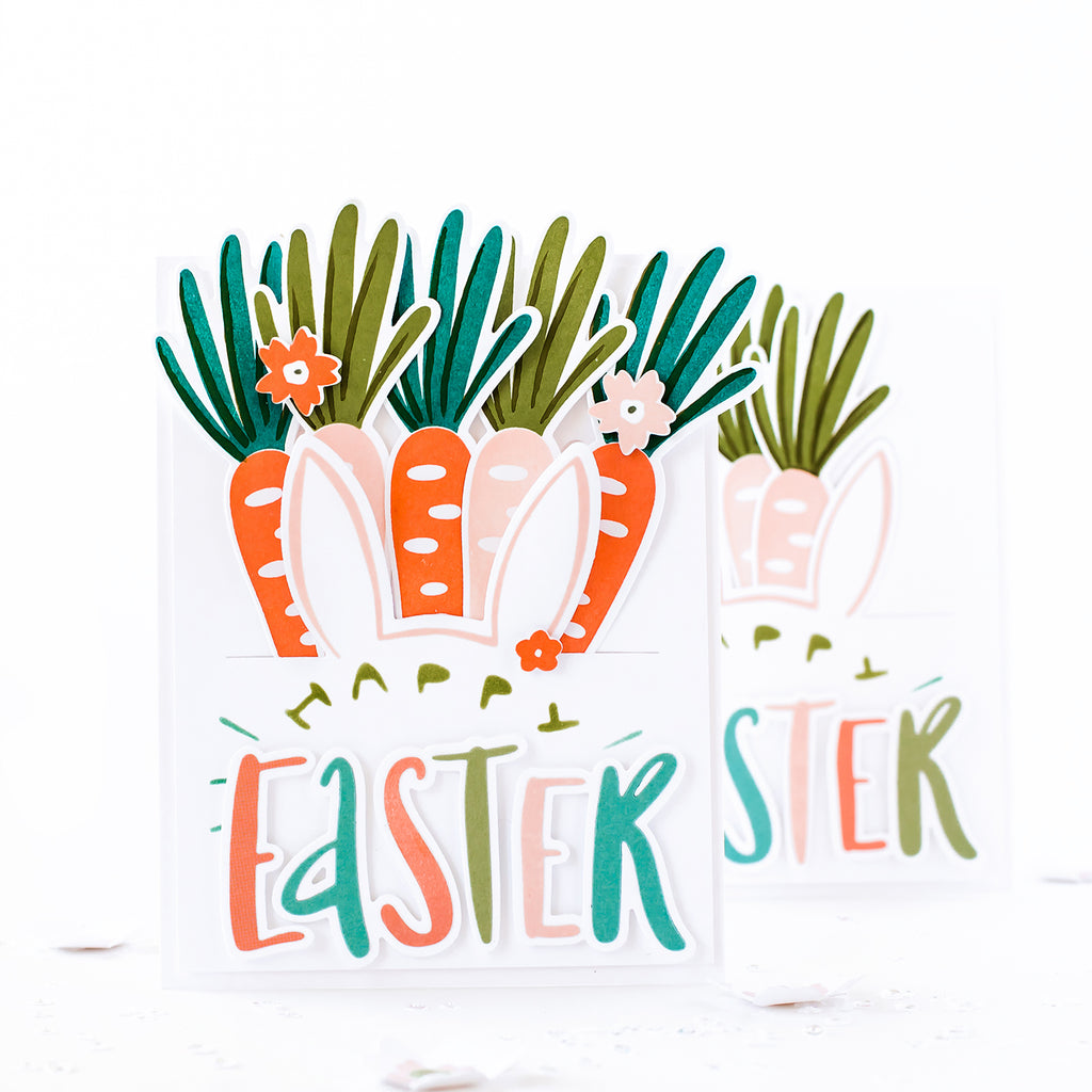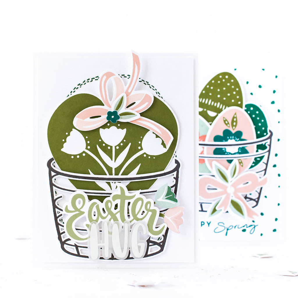 Can be used with our Egg Hunt stamp set or alone. The layered sentiment is perfect for creating rainbow greetings because each letter cuts as as a standalone element, which can then be layered onto the thicker base. Also fun to rearrange all the letters to get sentiments such as 'Easter Hug'!