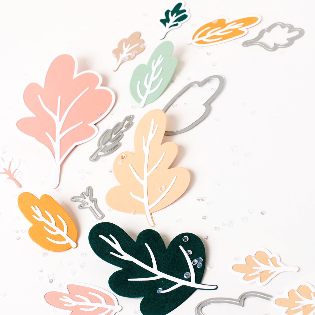 Coordinates with our Falling Leaves dies and makes for fabulous, easy shaker-making fun! If shakers aren’t your thing, you can use these dies to build dimensional leaves, or add an an outline to the leaves.