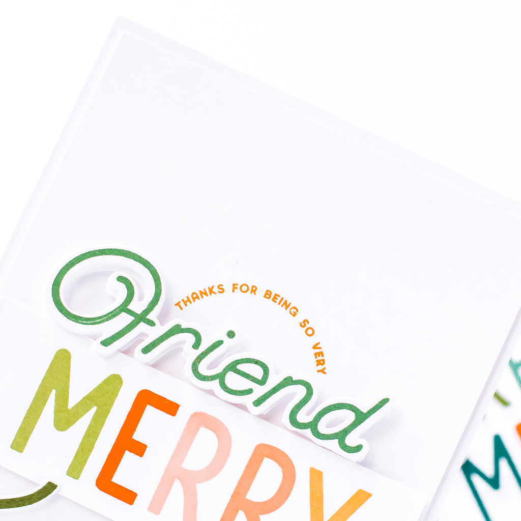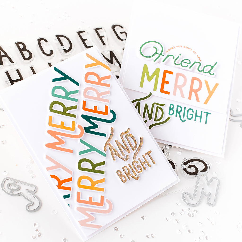 These letters also perfectly coordinate with our Merry Christmas, Vintage Merry Christmas and Happy New Year stamps and dies from last month's release. We LOVE stamping these in a soft hue, and using the individual letters to add a pop of color. It's our way to skip the masking, the mess and speed up lettering projects. With the help of our Festive Words set - which is full of conjunctions and add-on words - it really takes lettering to the next level!