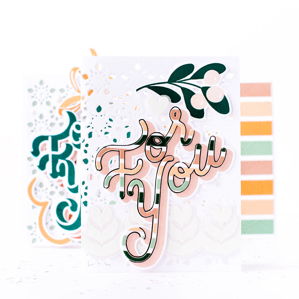 Typography is among our favorites to explore and design. There are so many possibilities that lie within a good sentiment set - from layering, to shadowing, to building *just* the right greeting! We love every step of it, and we've tried to incorporate it into this set! The 'For You' greeting can be used all on its own, or mixed with the shadow element. It can be taken a step further with additional sentiments that range from inspirational to gifting greetings, or it can be accented with the swirls, or used as a solo gift tag! However you style this set, it's a staple for Holiday gifting, and stretches way beyond the festive Season.