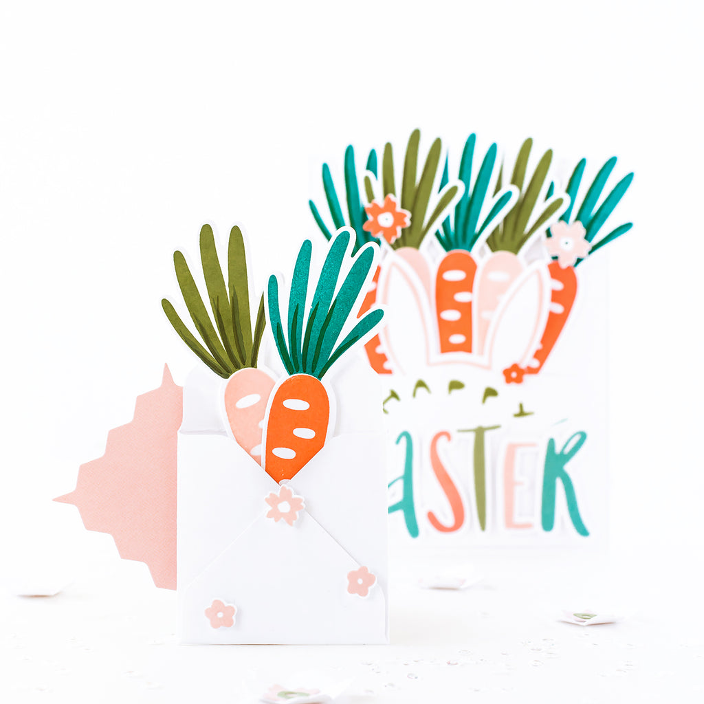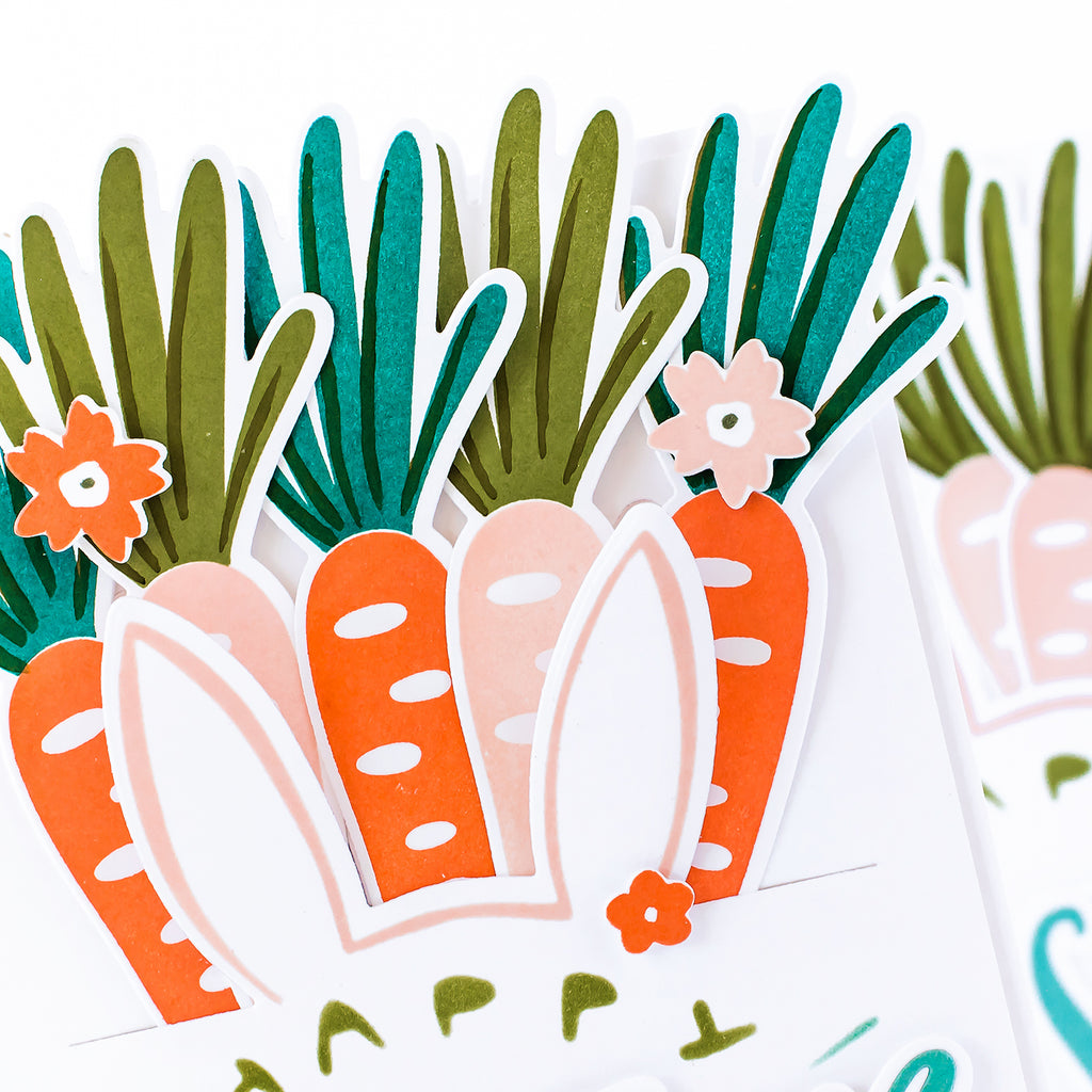 Modern, fun and whimsical! This set goes the extra mile with a sentiment that makes it easy to stretch these cute carrots well beyond Easter and Spring. We love the letter shading - use one style or both, or go completely without! The coordinating die cuts the sentiment with the shading space provided, so you have room to play! Also, how cute are the bitty carrots sticking out of the ground?!