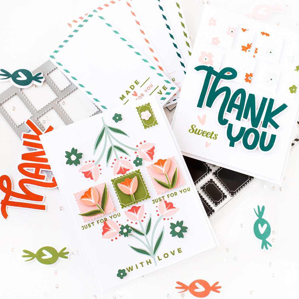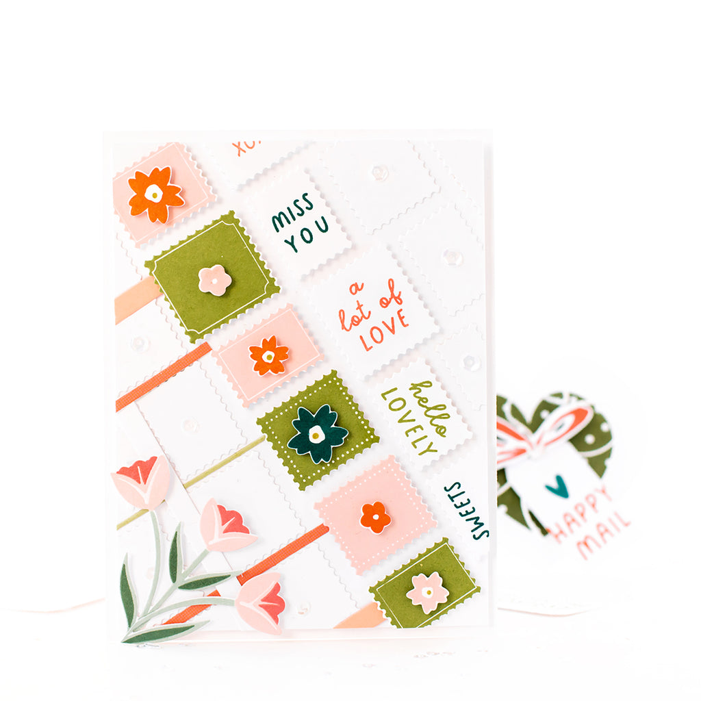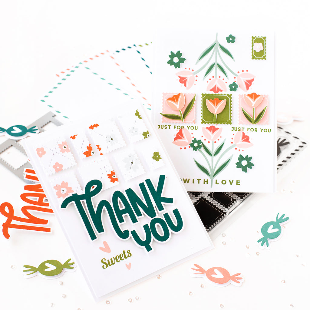 Coordinates with the Sweets stamp set, but can be used alone to cut piles of bitty postage stamp designs in one go. It’s also a handy dandy tool for lining up a grid card front, but you can wing it and try your own pattern. Why not try a diagonal, like we did! Please note, this die does not include an outer cut.