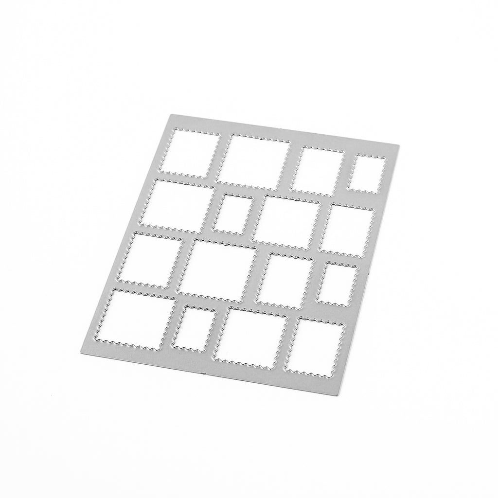 TIP: to cut the coordinating stamped designs, stamp the entire postage grid design, and line up the grid cover plate atop that. Please note, since the stamp is a smaller version of the cover plate, the cover plate is designed so that only half will line up to cut the designs. We recommend repeating above steps and stamping in a few colors, to make as many bitty postage stamps as your heart desires!