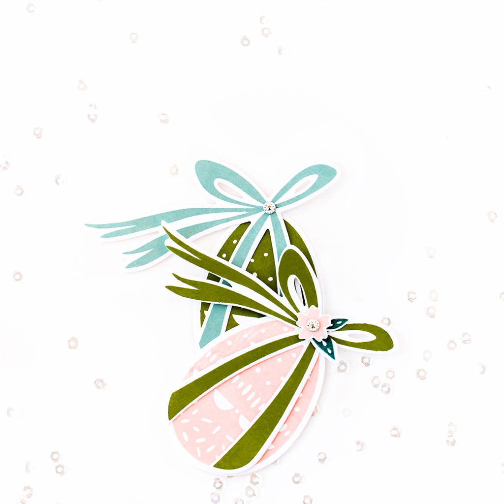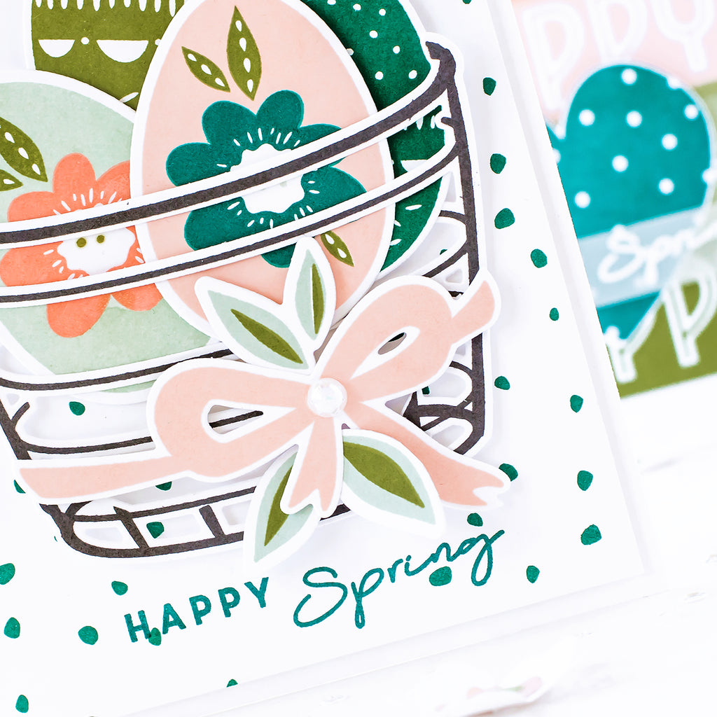 TIP: This set includes an egg die to help cut individual eggs from our Eggcellent stamp, just in case you don't want to splurge for the Eggcellent die. It also includes an egg cluster die that helps position 5 eggs perfectly so they can fit inside the basket! You can also freestyle-arrange the eggs, like we have on our card!