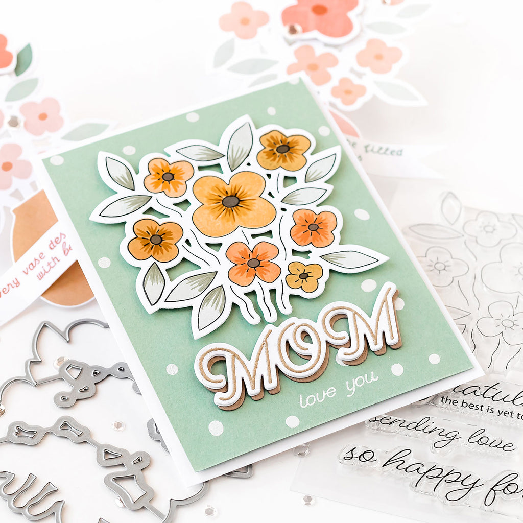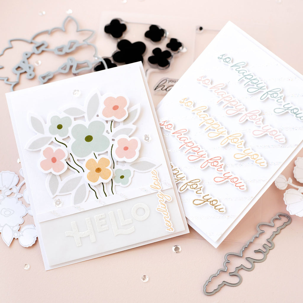 Coordinates with our Celebration Bouquet stamp set, allowing you to easily cut the floral image and the sentiments "So Happy For You" and "Sending Love".