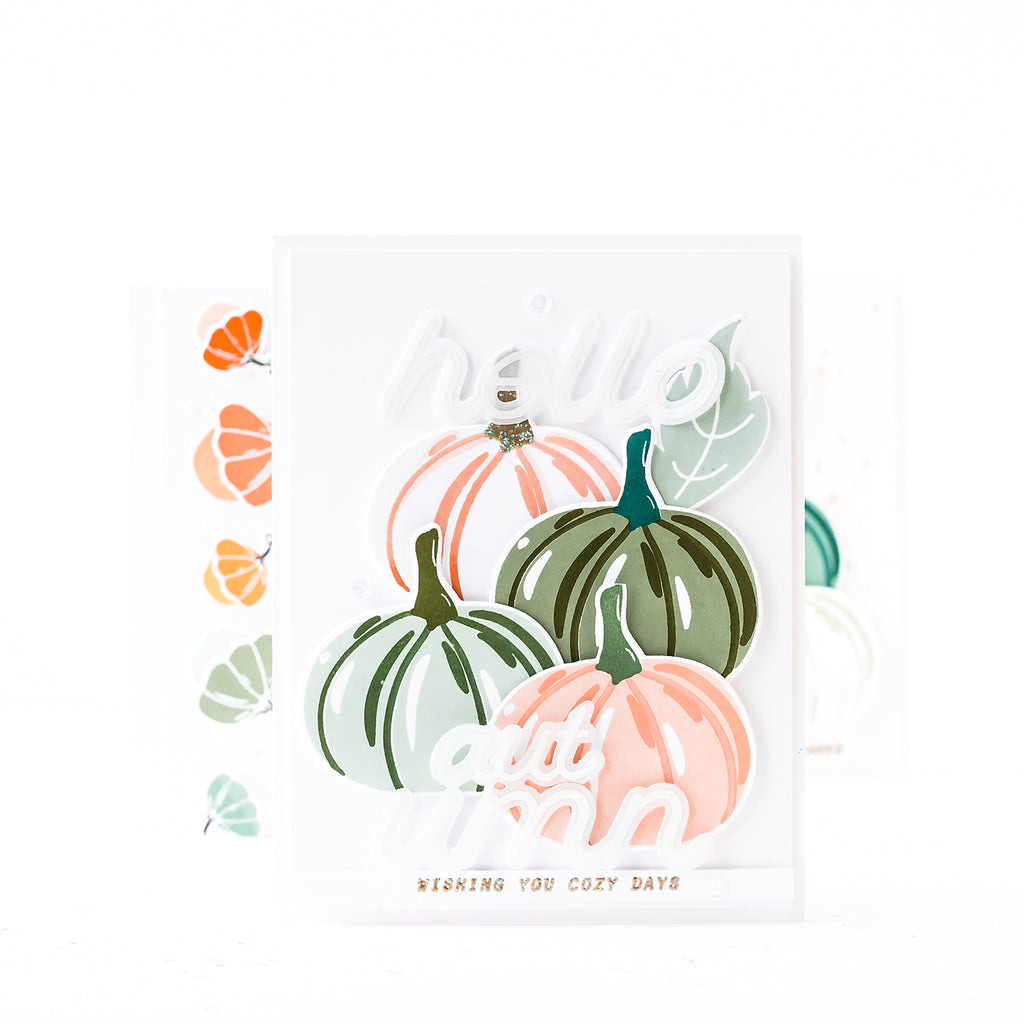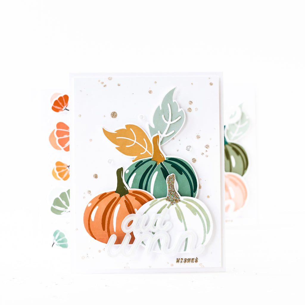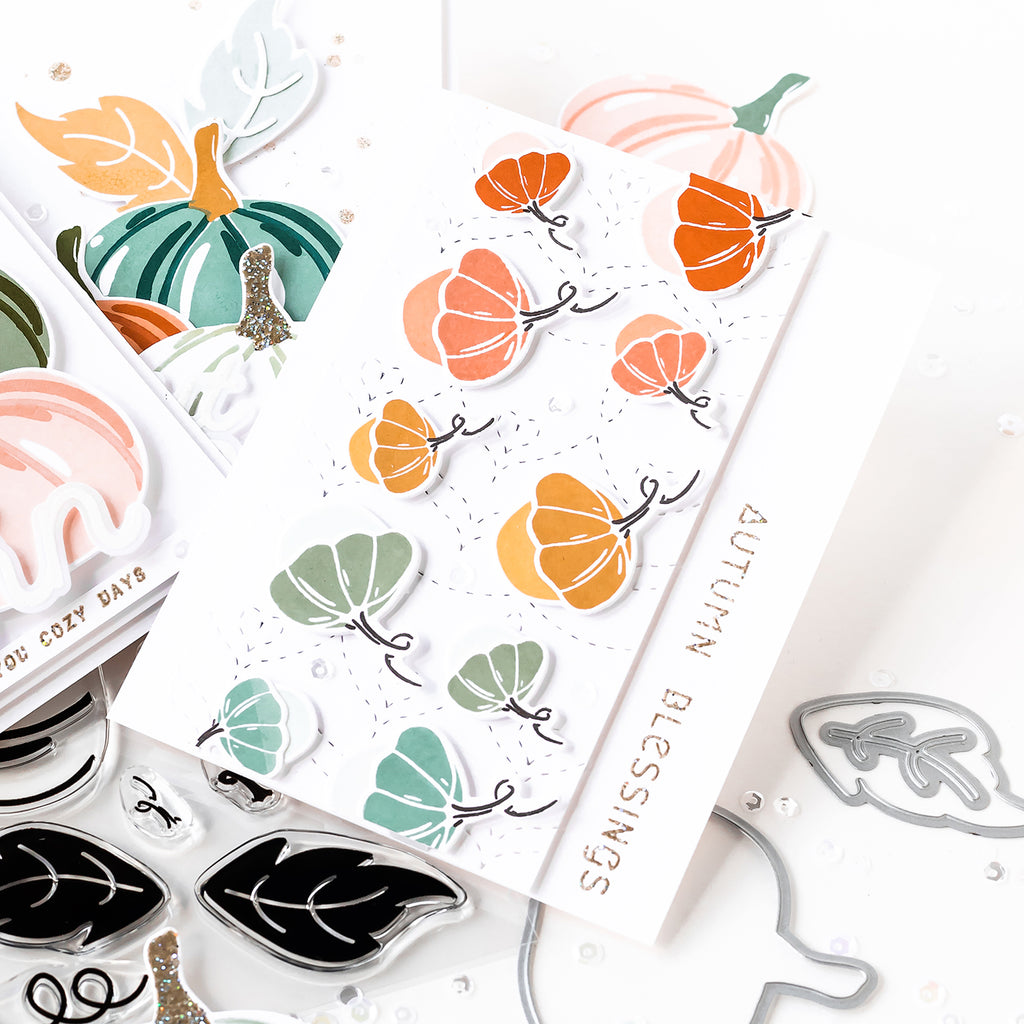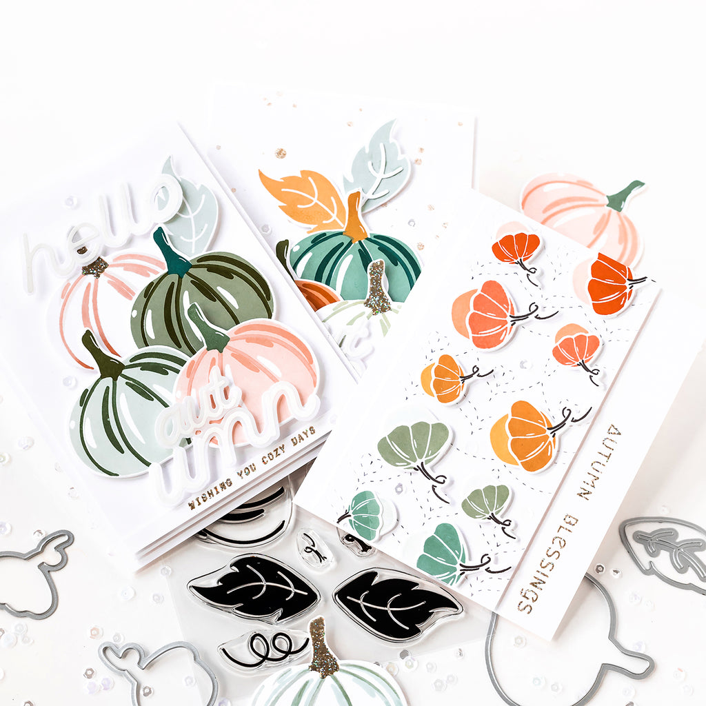 Oh Fall...With all your beautiful colors. We do love you so! And nothing makes us happier than admiring a colorful pumpkin patch. So we’re bringing it to the craft room! Whether heirloom pastel or a crimson orange, we simply can’t get enough of stamping these cuties! We’ve piled them into a set that's ready to throw a splash of Autumn into any project. The mix-and-match layers, as well as 'painted' detailing, gives the designs an extra touch of warmth and versatility, and we've included two sizes of tiny gourds, as well as leaves, for easy scene building.