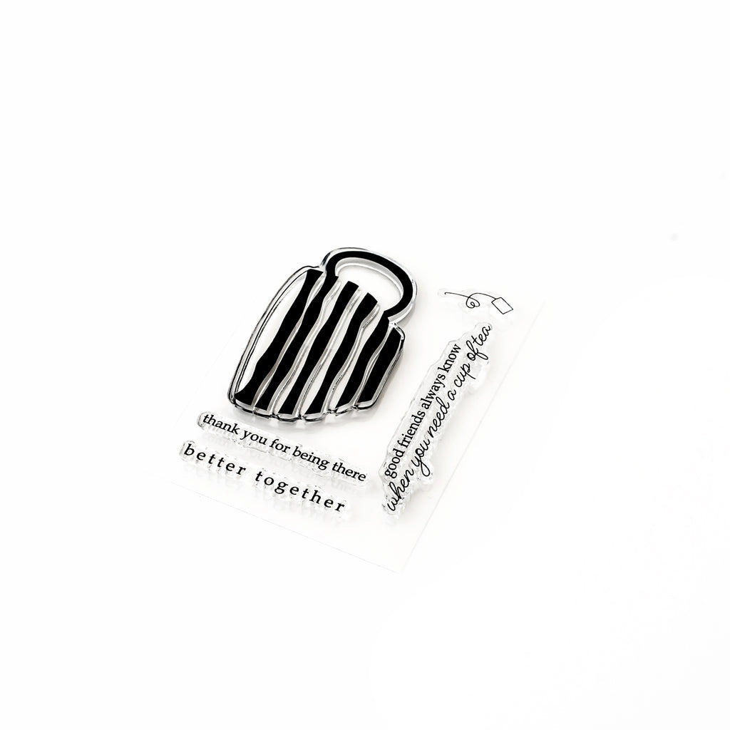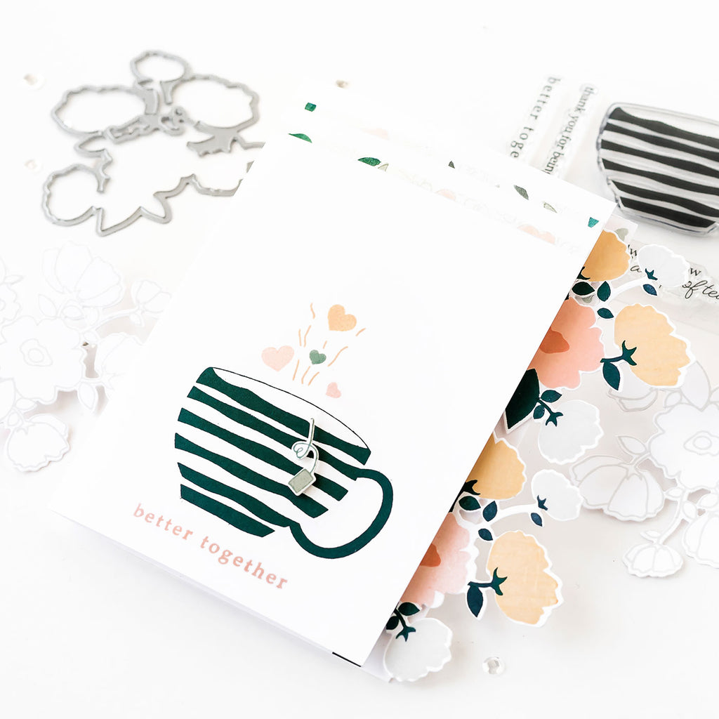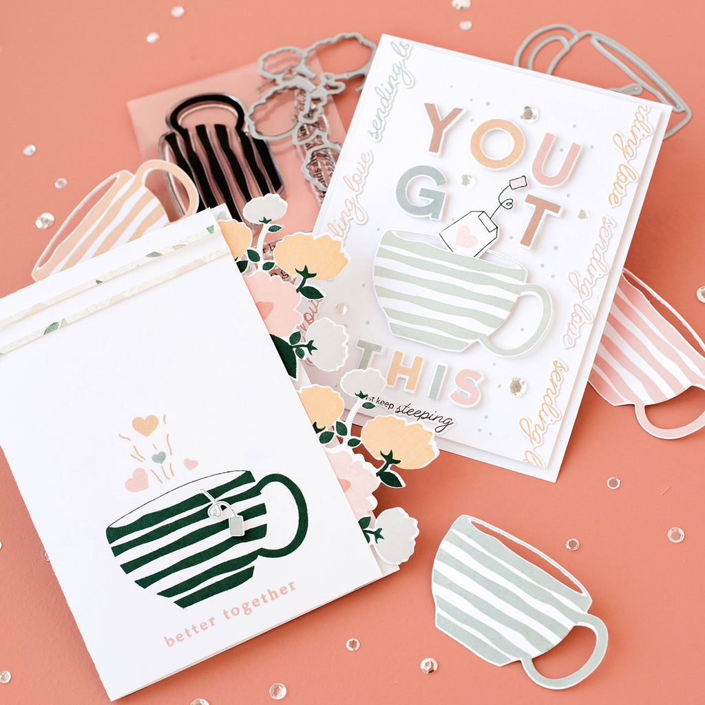 Love tea? So do we! This little set is perfect for no-fuss creativity. Three sentiments + endless color options for our stripe-y cup, mean you’ll be creating card sets to envy in no time! Oh, and don’t forget -this little stamp coordinates with other product in our Tea Time Collection (try it with the tea baggie from Blooming Teapot). This tea cup is a bit smaller than the one in the Cup of Happy set, but it still works perfectly with the Cup of Happy floral and coordinating Cup of Happy Floral die.