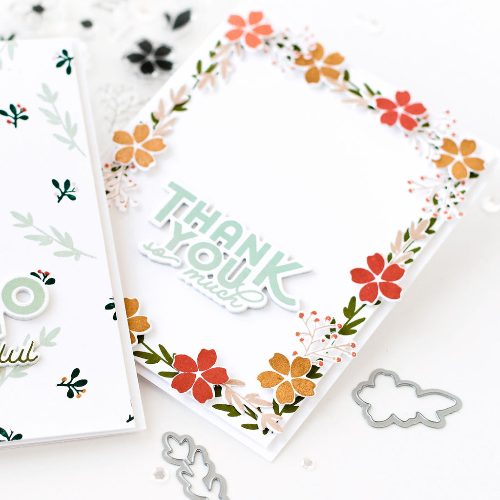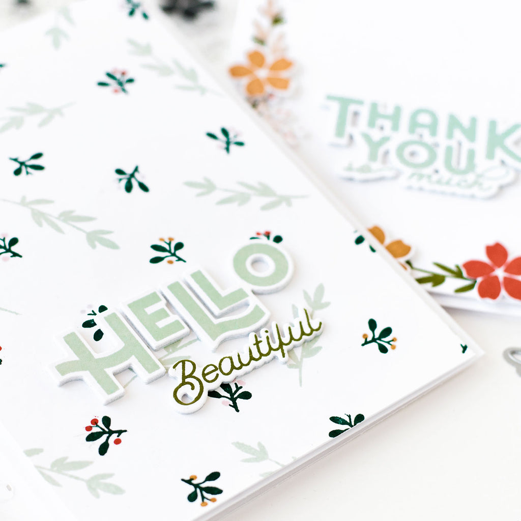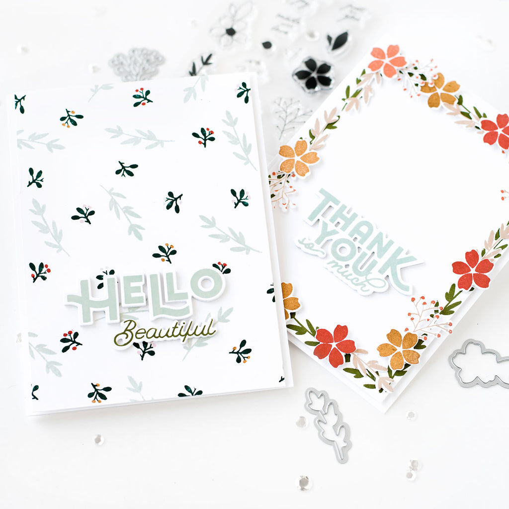 This set may be teensy tiny, but don’t let it fool you. It is a workhorse. Use the bitty florals for backgrounds, spice up your cards with foliage accents, framing, and so much more. Then add one of the cute sentiments, and admire your work of art!